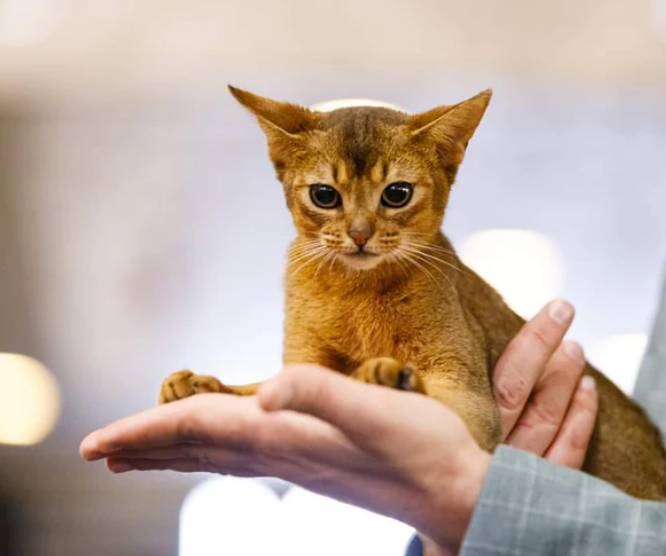 The Abyssinian is a breed of domestic cat originating from Africa. It has a slender and graceful body, a slightly rounded triangular head. The ears are medium-sized and wide at the base. It has large almond-shaped eyes, short fur, long legs, a medium-length tail that is thick and tapered at the end.